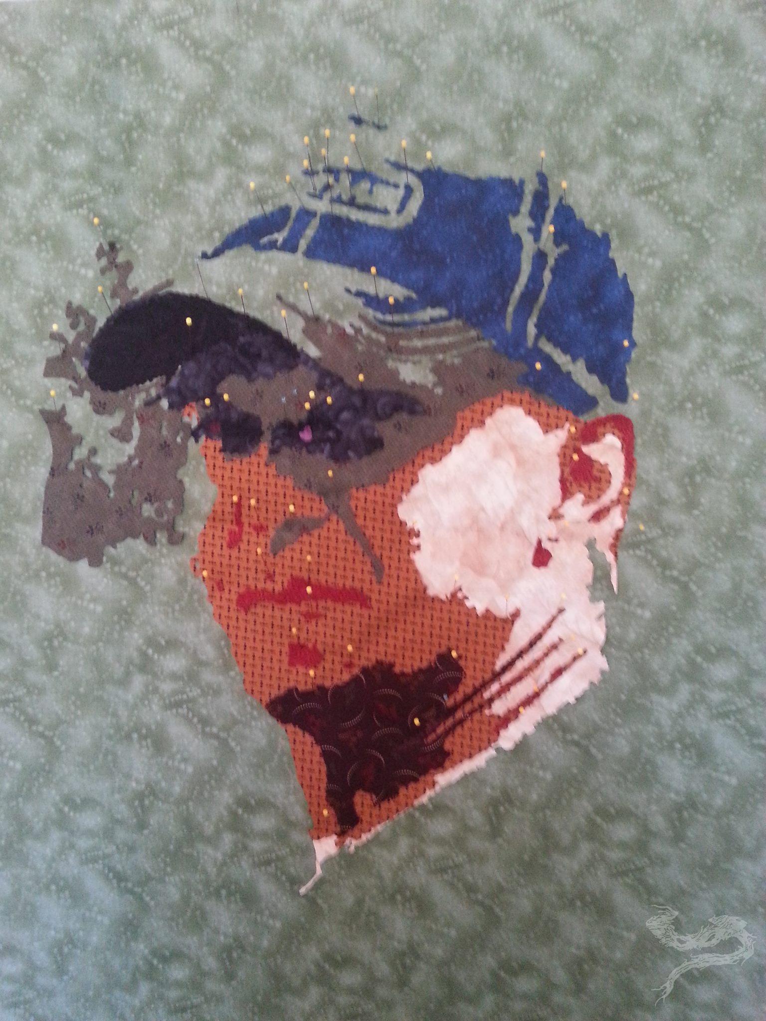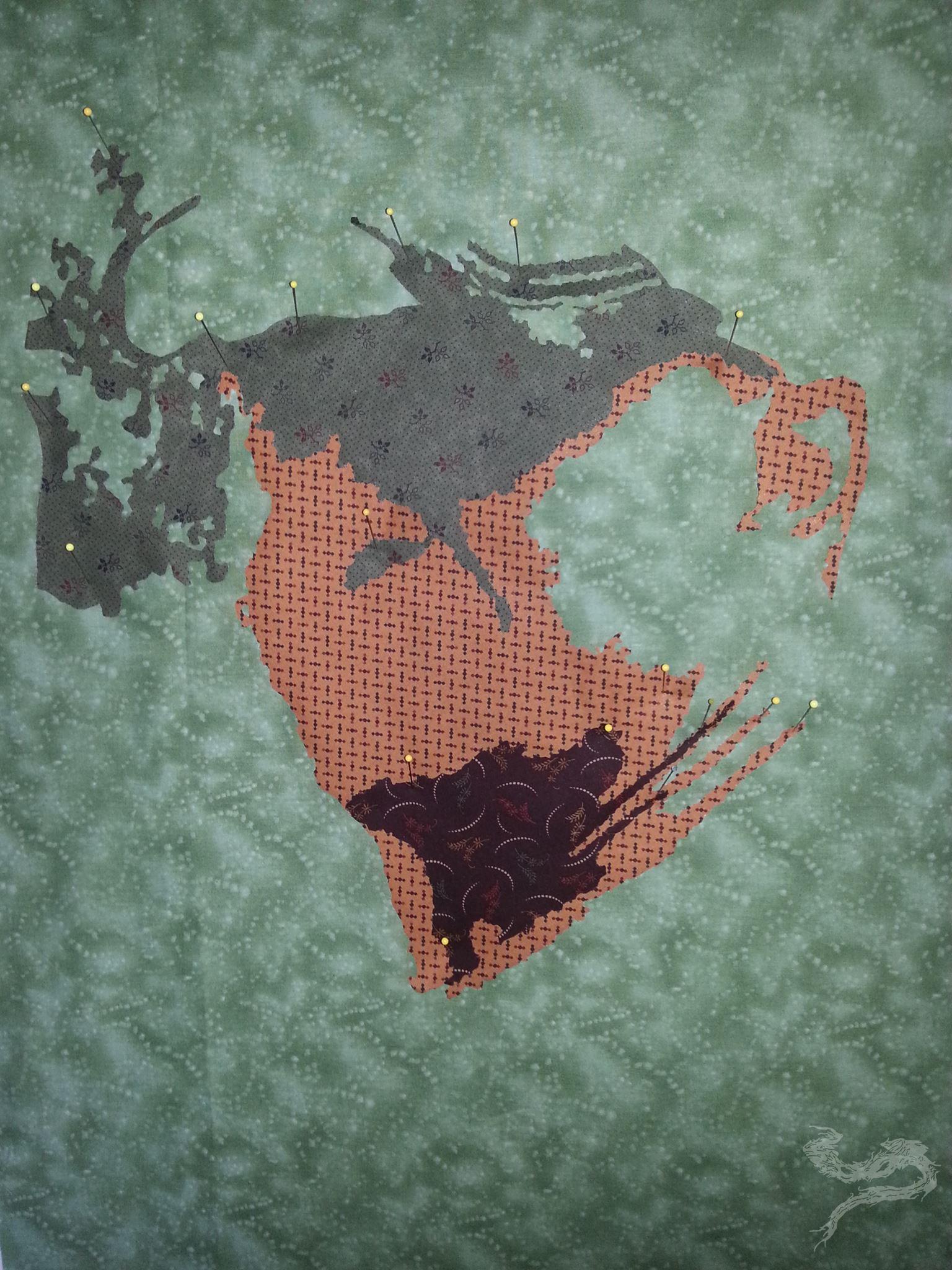 Almost 8 days from when I first put the background fabric on my design wall and taped my base pattern to my light wall, I had a finished art quilt on my hands. The best part? I had an entry for a fabric challenge. (Fabric challenges were something I used to shy away from. No, I have no idea why. I just did.)