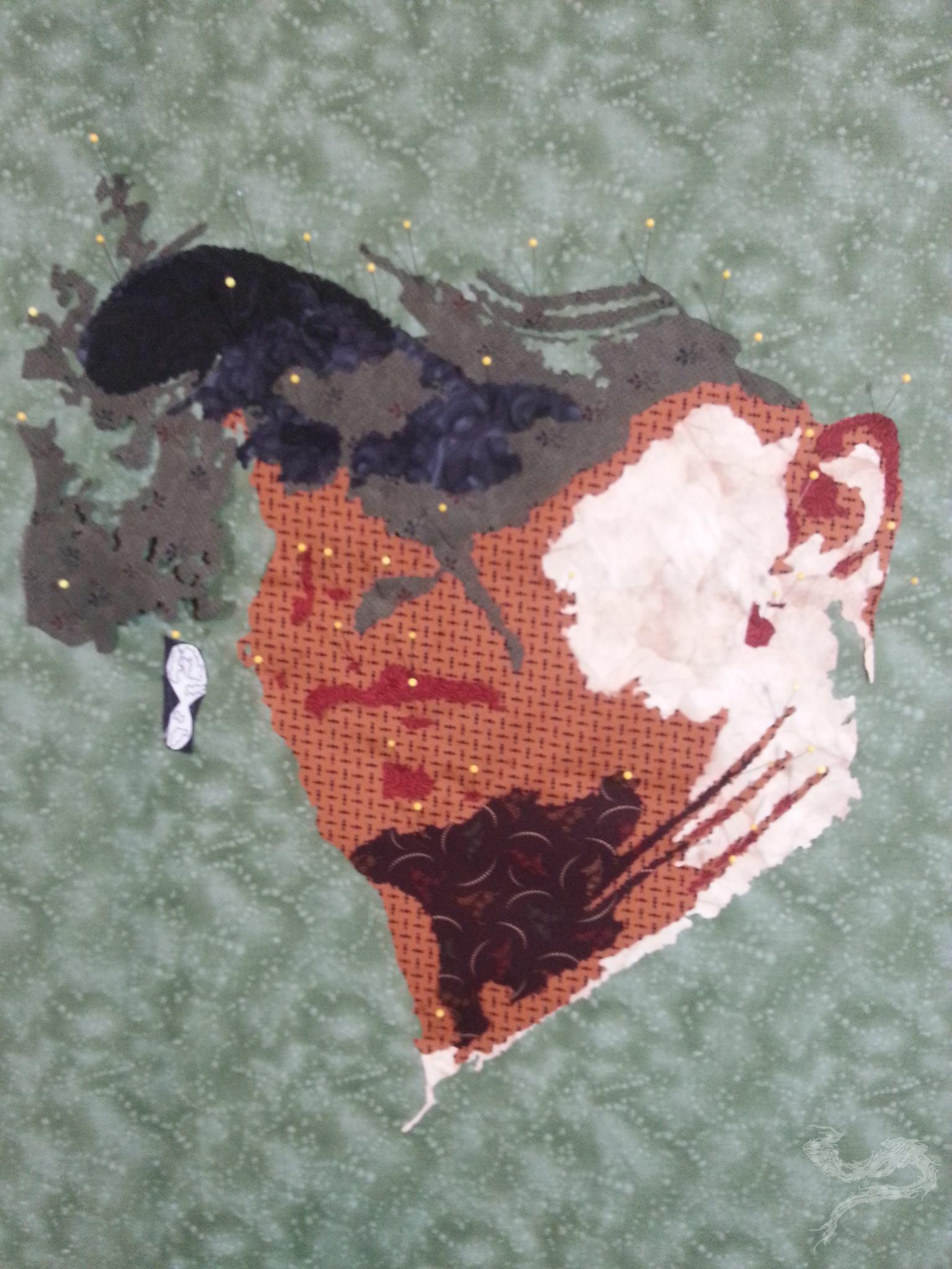 I wasn’t too keen on the shadowing for the eyes, but this was the fabric I had available. I kept moving, but this seemed “off”. I’d come back to it, once I’d gotten the rest of the main pieces in place. Until then, it was a temporary fix.